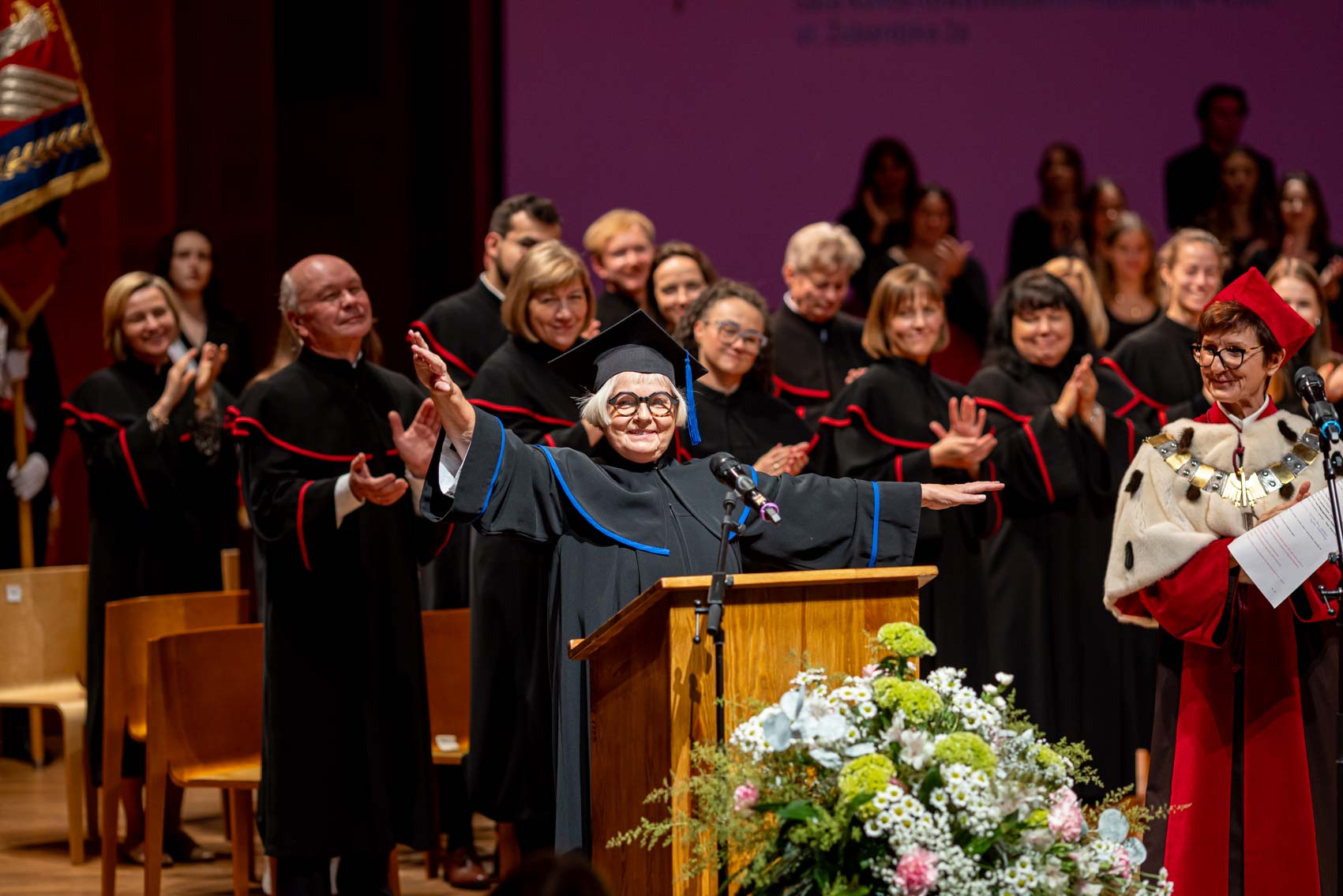 Uroczysta inauguracja roku akademickiego 2024/2025 zostanie na długo w naszych sercach! W środę 9 października 2024 roku społeczność naszej Uczelni powiększyła się bowiem o nowych studentów i doktorantów, a do grona doktorów honoris causa Akademii dołączyła Maestra Ewa Wycichowska – tancerka, choreograf, pedagog, nauczyciel akademicki, pierwsza w Polsce profesor sztuk muzycznych w zakresie tańca, wieloletnia primabalerina Teatru Wielkiego w Łodzi, w latach 1988–2016 dyrektor naczelny i artystyczny Polskiego Teatru Tańca – Baletu Poznańskiego. W polskiej historii sztuki tańca jest jedną z najwybitniejszych postaci, które zmieniły oblicze artystyczne i edukacyjne tej dziedziny – ambasadorem polskiej sztuki tańca na całym świecie. Jak podkreślano wielokrotnie w trakcie uroczystości, jest to pierwszy w Polsce doktorat honoris causa dla tancerki i choreografa, i jeden z pierwszych w tej dziedzinie w Europie.