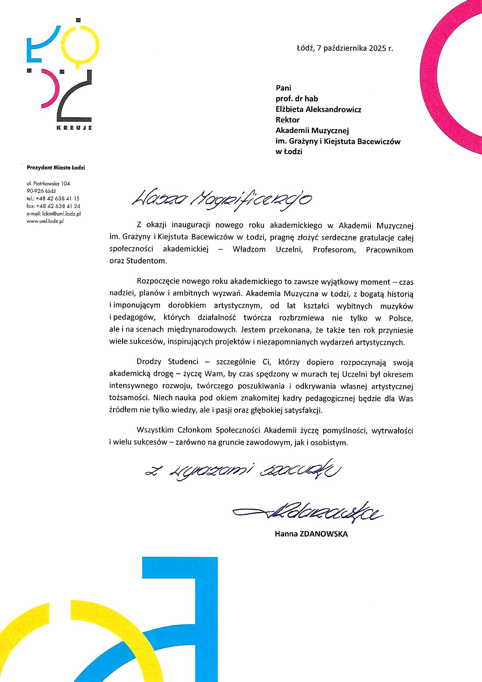 Z okazji jubileuszowej uroczystości inauguracji roku akademickiego gratulacje przesłali: